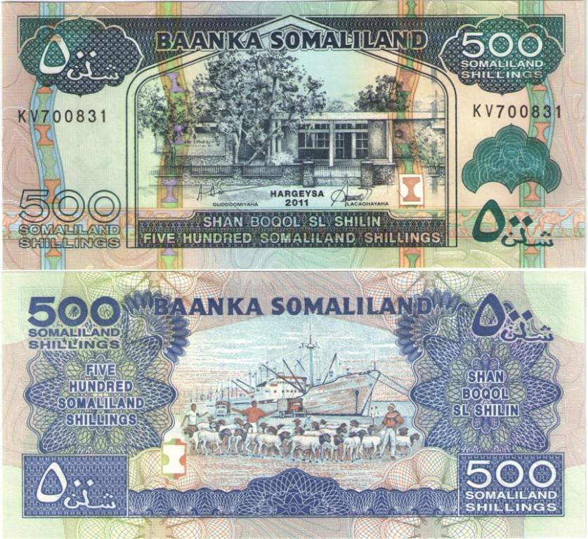 Лицевая сторона: по центру изображено здание банка Сомалиленда в Харгейсе. Сверху надпись: "BAANKA SOMALILAND". В правом верхнем и левом нижнем углах указан номинал: "500 SOMALILAND SHILLINGS".