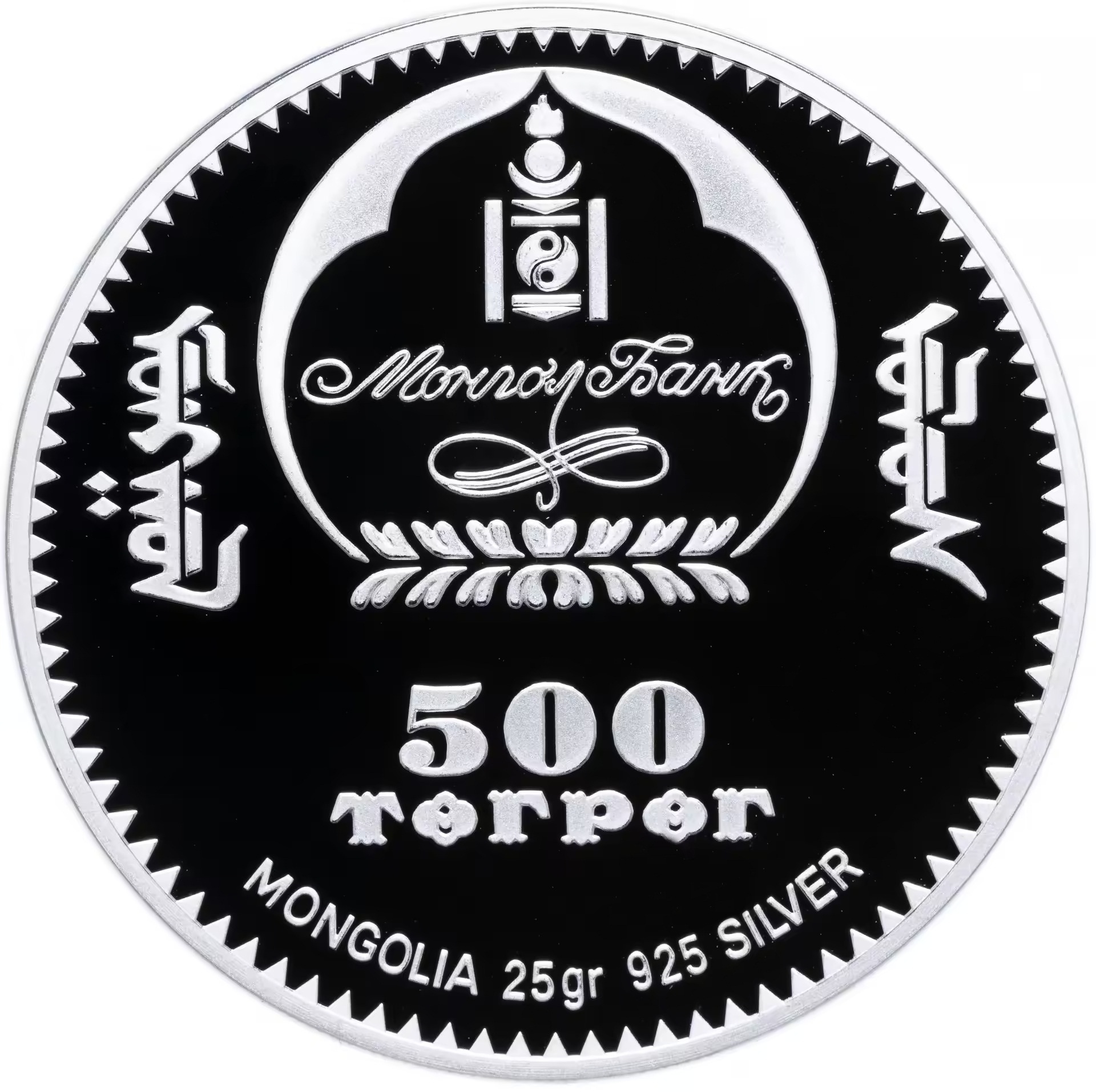 Аверс: в центре монеты помещена эмблема Монголбанка — центрального банка Монголии. По бокам отчеканены графемы, записанные классической письменностью. Ниже указан номинал: "500 ТӨГРӨГ". Вдоль зубчатого выступающего канта выбито: "MONGOLIA 25 gr 925 SILVER".