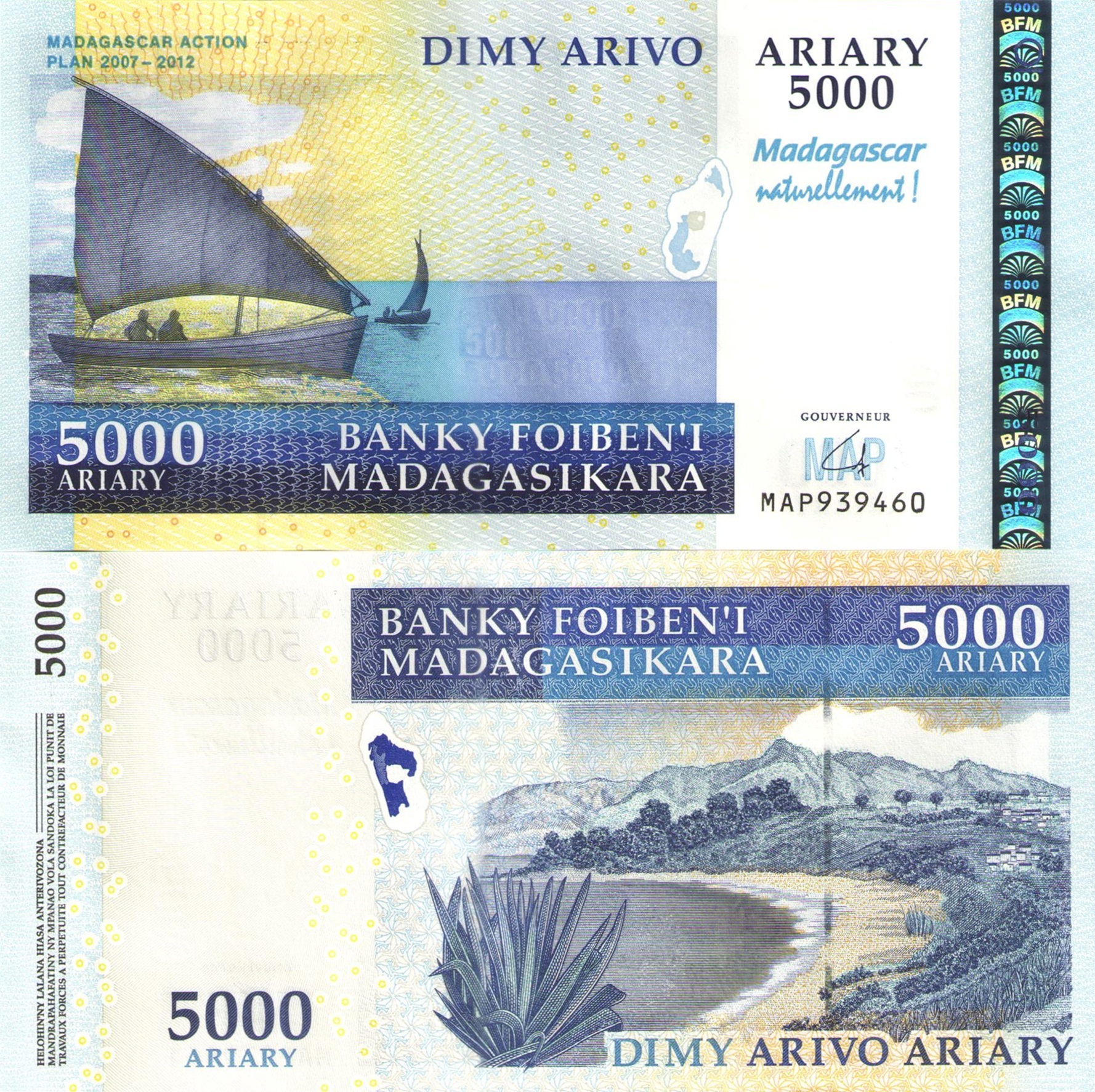 Лицевая сторона: в центре боны изображены лодки. В правом верхнем углу и нижнем левом указан номинал банкноты: "5000 ARIARY". По центру надпись: "DIMY ARIVO". Внизу наименование банка: "BANKY FOIBEN'I MADAGASIKARA", а правее снизу размещен серийный номер банкноты. В левом верхнем углу надпись: "MADAGASCAR ACTION PLAN 2007-2012".