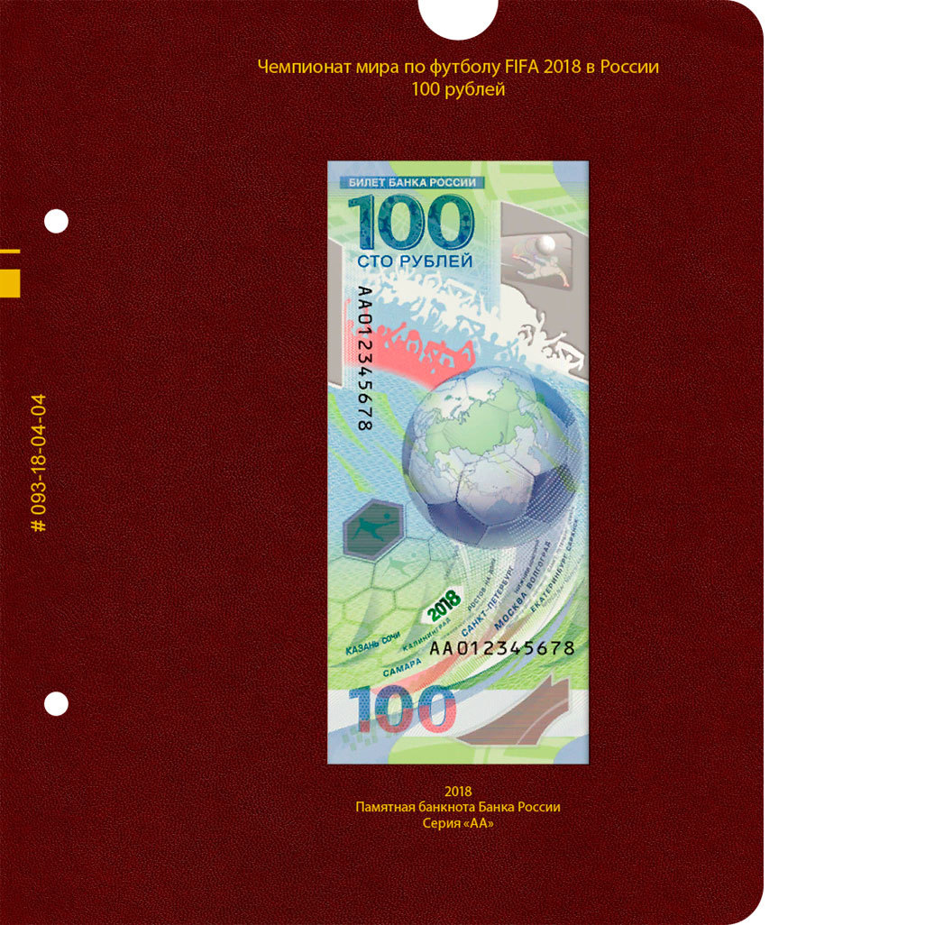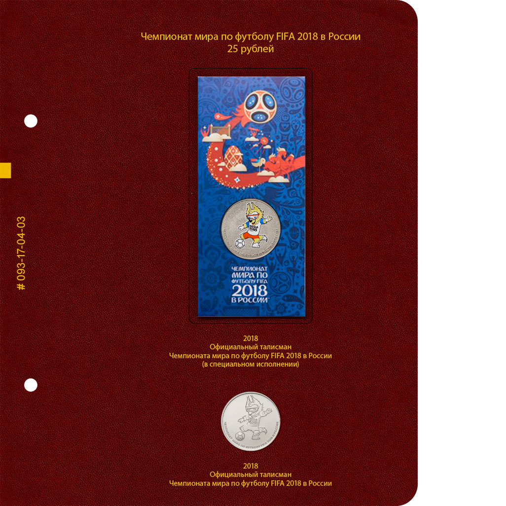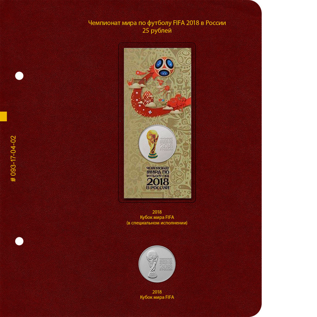 Альбом для коллекции серии памятных монет, посвященных Чемпионату Мира по Футболу в России 2018 года. В альбоме размещаются монеты номиналом 25 рублей (в т.ч. коллекционные монеты в блистерах) и памятная банкнота 2018 года. Монеты располагаются на страницах парами: сверху монета в блистере, в цветном исполнении, снизу - обыкновенная. Отдельный лист отведен под памятную полимерную банкноту номиналом 100 руб.