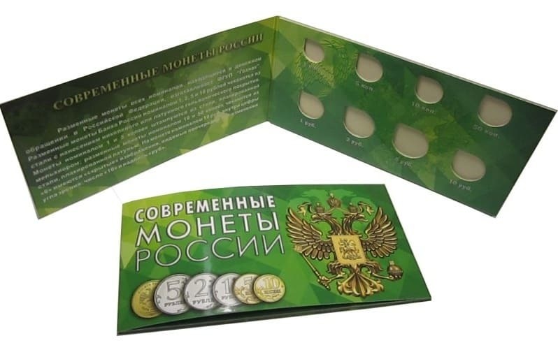 Буклет предназначен для хранения современных монет России регулярного чекана номиналом 1, 2, 5, 10 рублей, 1, 5, 10, 50 копеек.