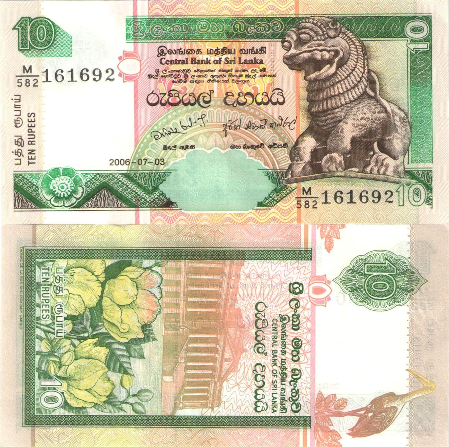 Оборотная сторона: в верхней части изображен расписной аист и номинал в розетке: "10". По центру расположен президентский Дворец Секретариата в Коломбо, над которым надпись: "CENTRAL BANK OF SRI LANKA". В нижней части банкноты изображены цветы и номинал: "TEN RUPEES".