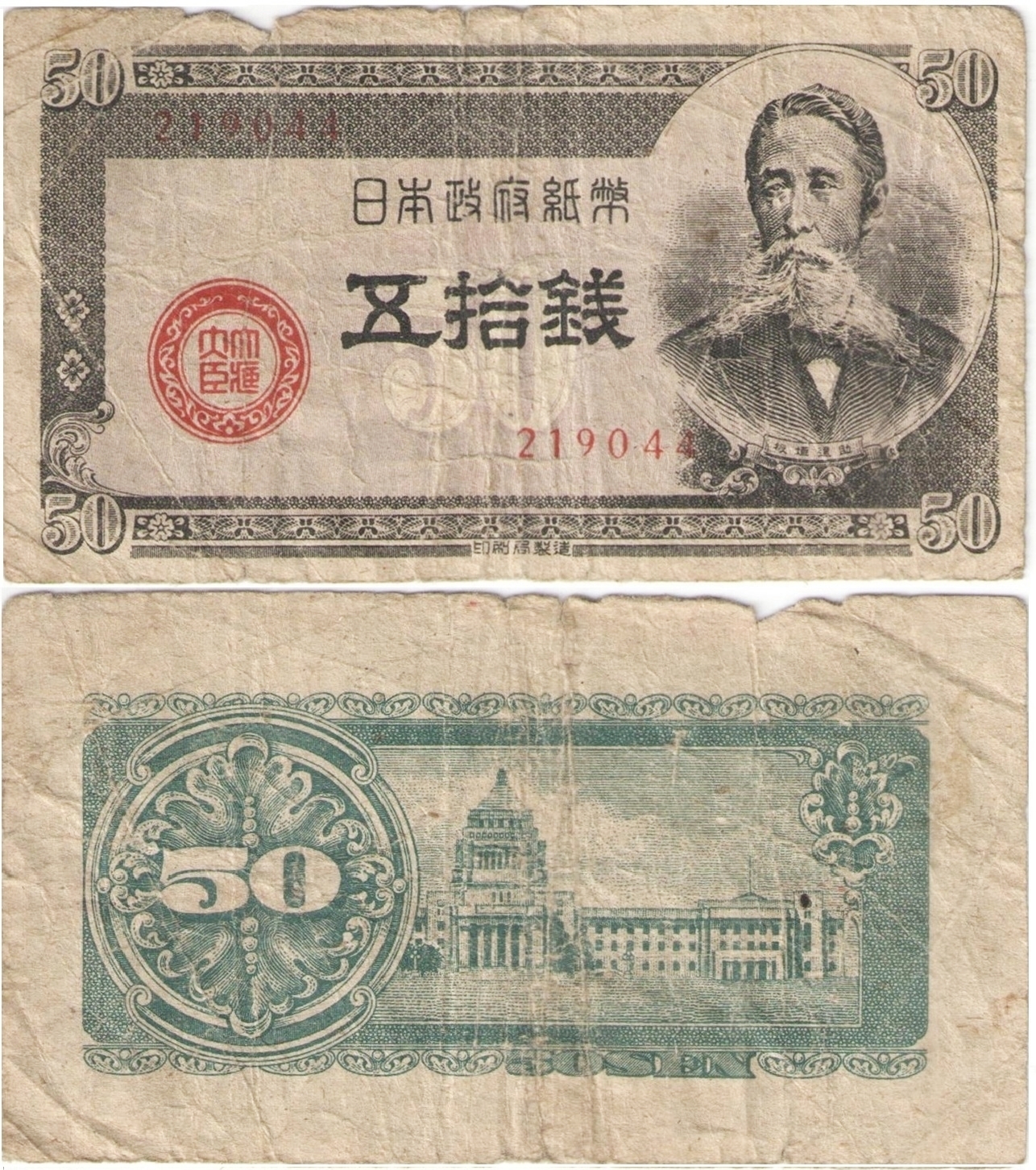 Оборотная сторона: в центральной части изображено здание Парламента Японии. Левее цифра номинала - "50". Снизу номинал прописью: "50 SEN".