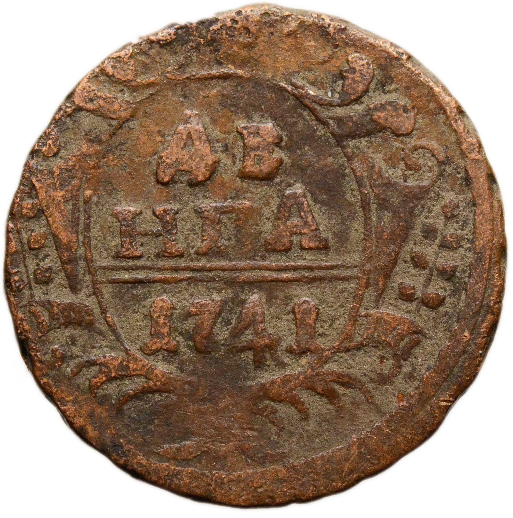 Реверс: по центру изображён картуш украшенный виньетками, по обеим сторонам две лавровые ветви, сверху - цветочная розетка. В картуше надпись в три строки, номинал и год чеканки: "ДЕНГА 1741". Между номиналом и годом две прямые черты.