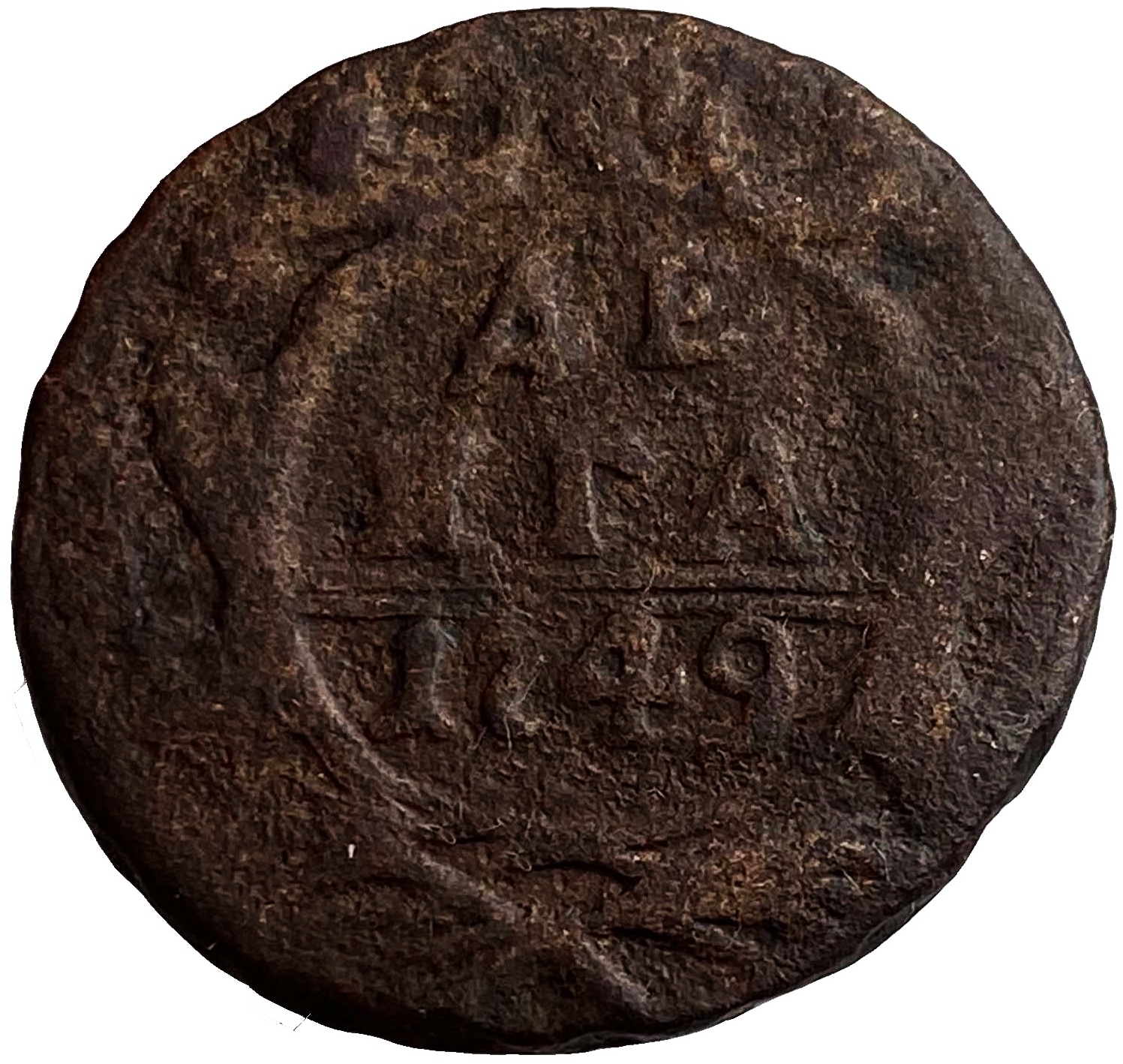 Реверс: по центру изображён картуш украшенный виньетками, по обеим сторонам две лавровые ветви, сверху - цветочная розетка. В картуше надпись в три строки, номинал и год чеканки: "ДЕНГА 1749". Между номиналом и годом две прямые черты.