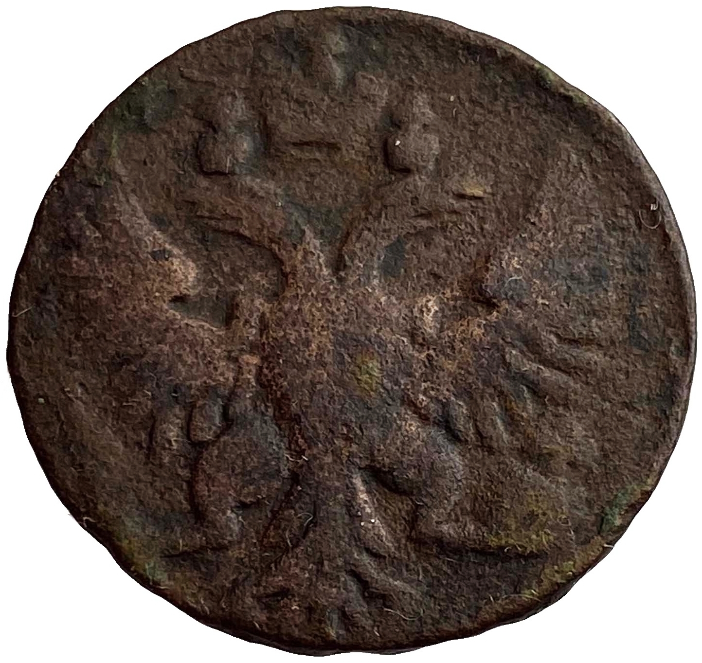 Аверс: в центре монеты изображен упрощённый Государственный Герб Российской империи - двуглавый орёл с поднятыми вверх распущенными крыльями. Головы которого увенчаны двумя коронами, третья, большая корона над ними. В правой лапе орла – скипетр, а в левой – держава.