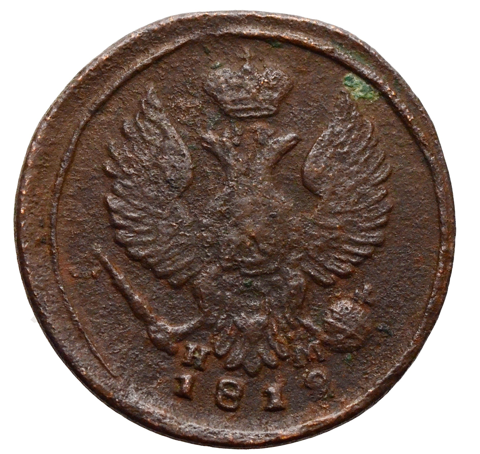 Аверс: по центру изображен Государственный Герб Российской империи - двуглавый орёл с поднятыми вверх распущенными крыльями. На головах которого две короны, а третья, большая над ними. На груди орла расположен Московский герб - щит с изображением Георгия Победоносца, поражающего копьем змея. В правой лапе орла – скипетр, в левой – держава. Под правой лапой – буква "Н", под левой – буква "М" - инициалы минцмейстера. Под инициалами год чеканки монеты: "1819".