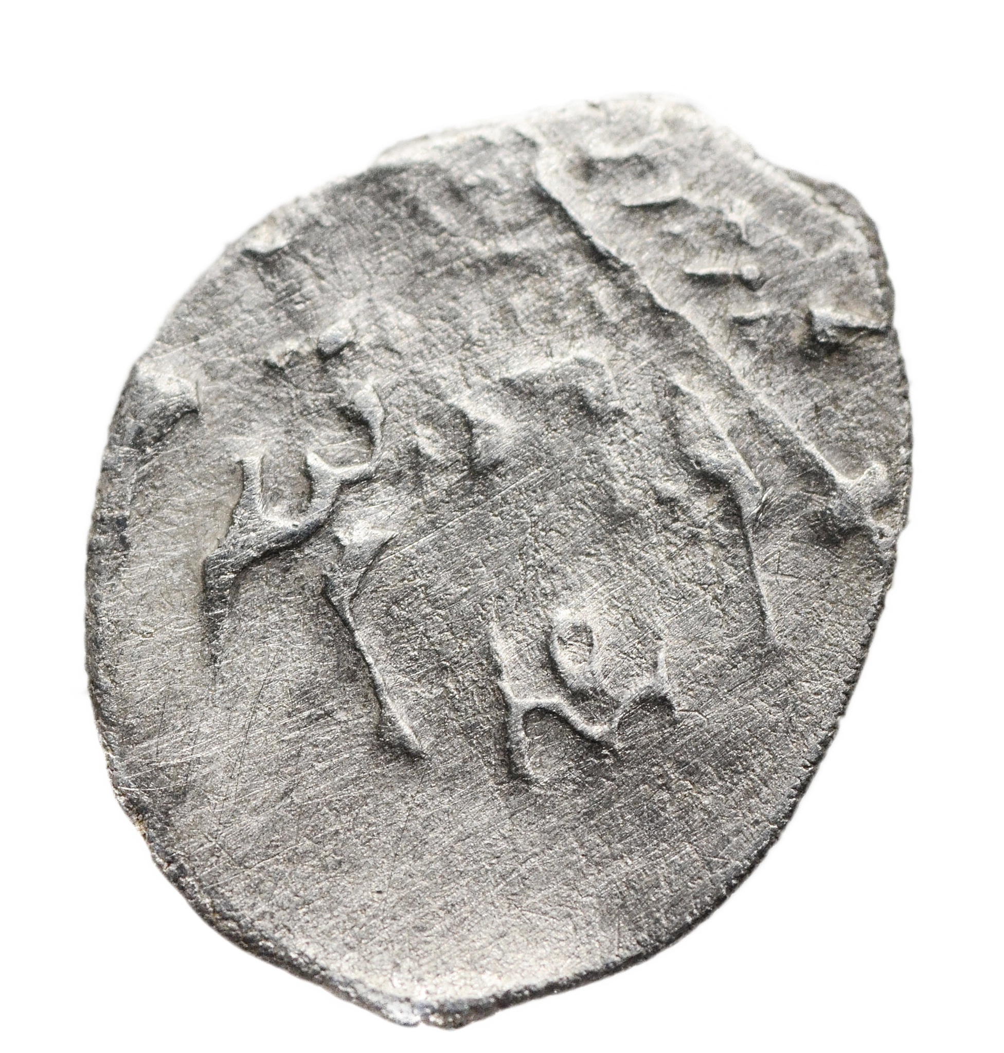Лицевая сторона: Всадник скачущий на коне, в трехчастном венце направо, держит опущенное копье. Сзади него развевается плащ. Буквы под конем: "О/М".