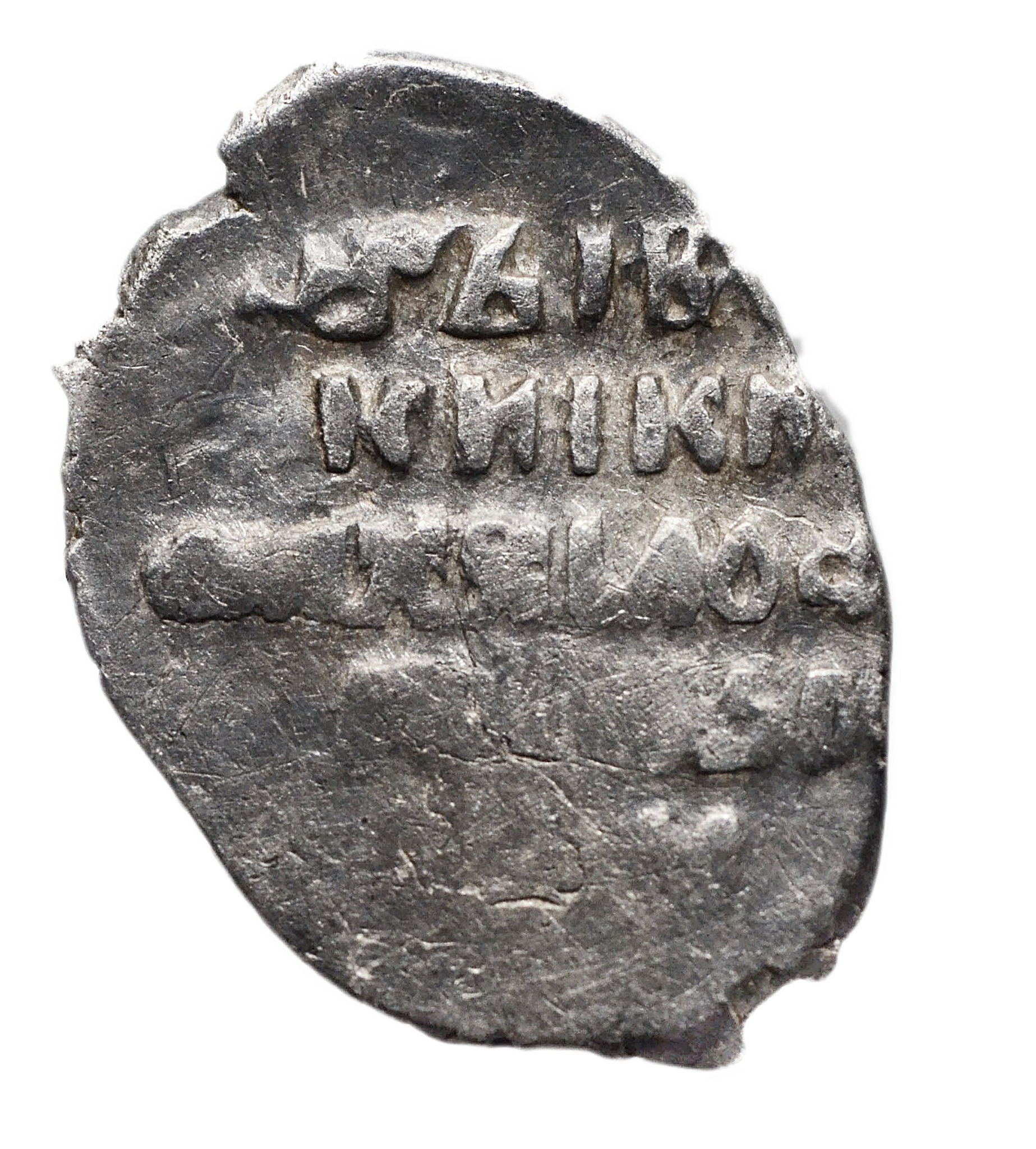 Лицевая сторона: Всадник скачущий на коне, в трехчастном венце направо, держит опущенное копье. Сзади него развевается плащ. Под конем буквы: "МО".