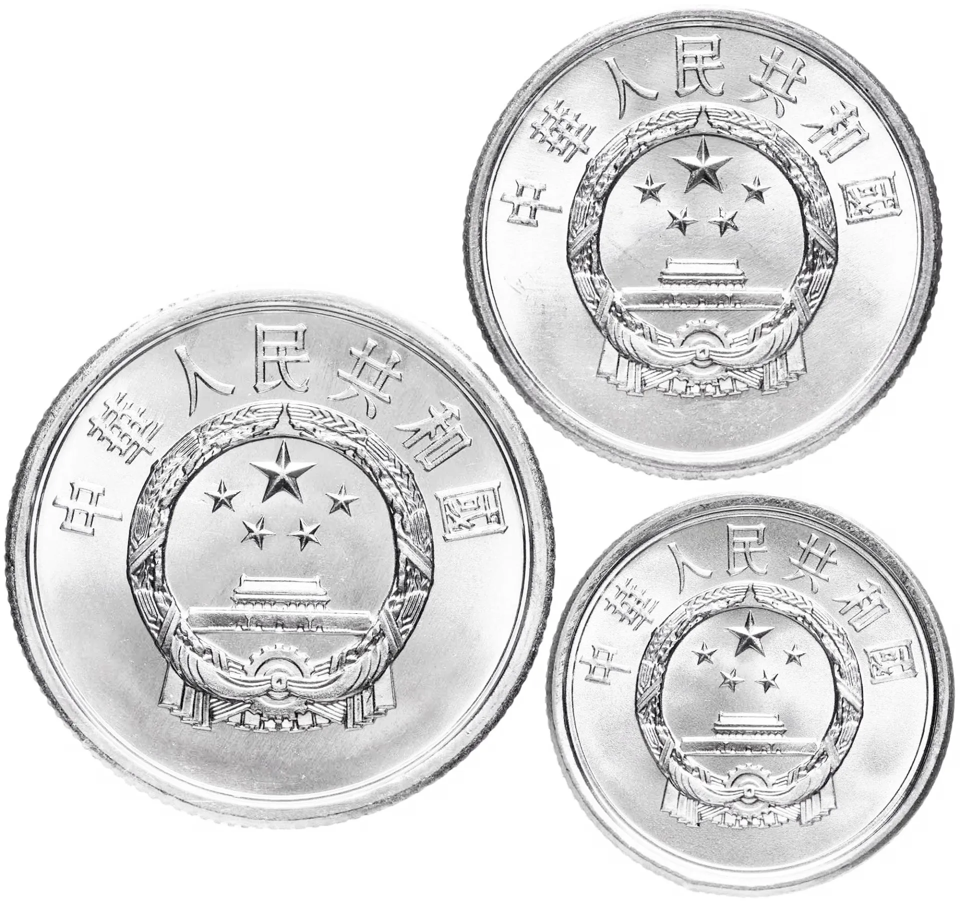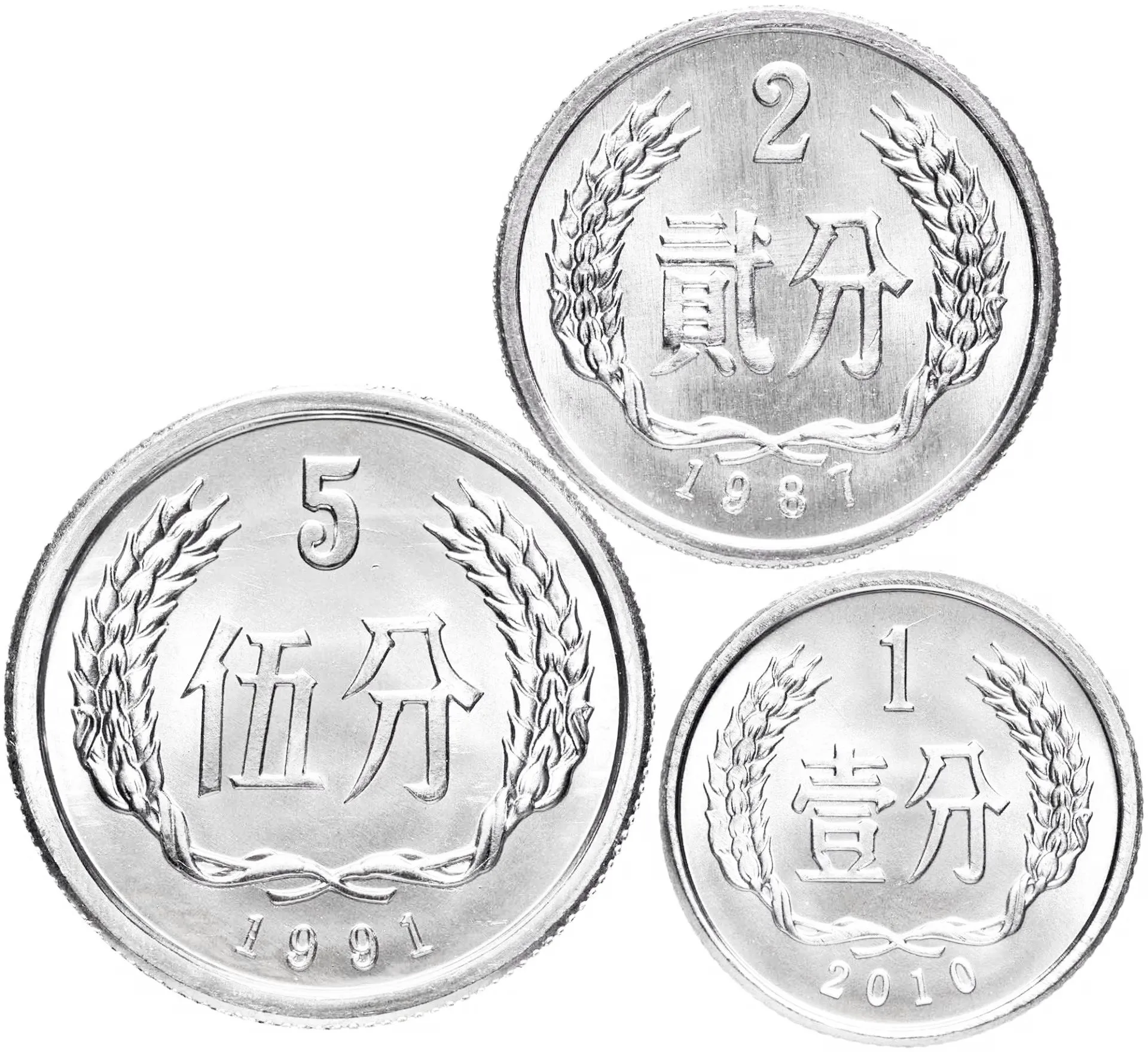Набор коллекционных монет Китая номиналом 1, 2 и 5 фыней (феней) в состоянии AU-UNC, выпущенных в период с 1986 по 2013 год (Китайская Народная Республика, КНР)