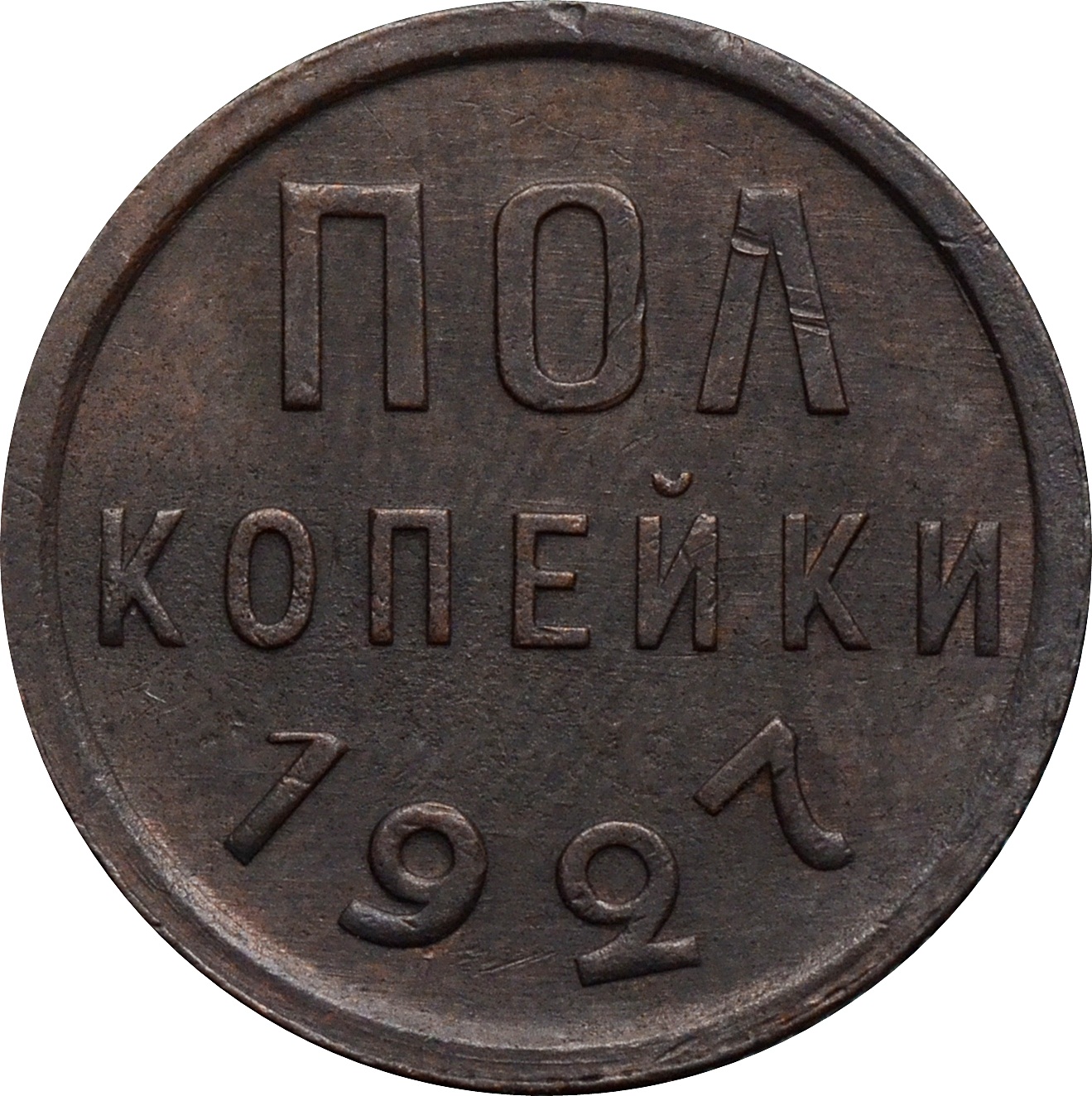 Реверс: по центру указание номинала в две строки: "ПОЛ КОПЕЙКИ", ниже год чеканки монеты: "1927".