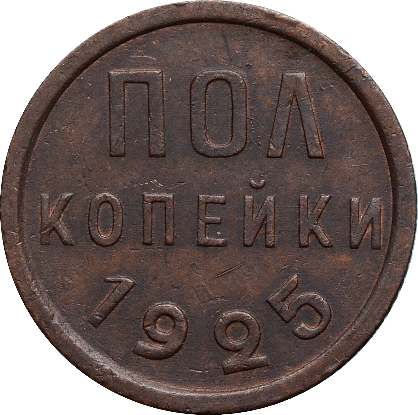 Реверс: по центру указание номинала в две строки: "ПОЛ КОПЕЙКИ", ниже год чеканки монеты: "1925".