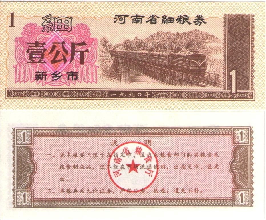 Лицевая сторона: по центру размещено изображение поезда, едущего по мосту через реку. В правом нижнем и левом верхнем углах номинал цифрой - "1". В самом низу год 1982, на китайском.