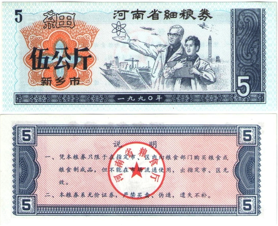 Лицевая сторона: по центру размещено изображение двух научных сотрудников на фоне города. В правом нижнем и левом верхнем углах номинал цифрой - "5". В самом низу год 1980, на китайском.