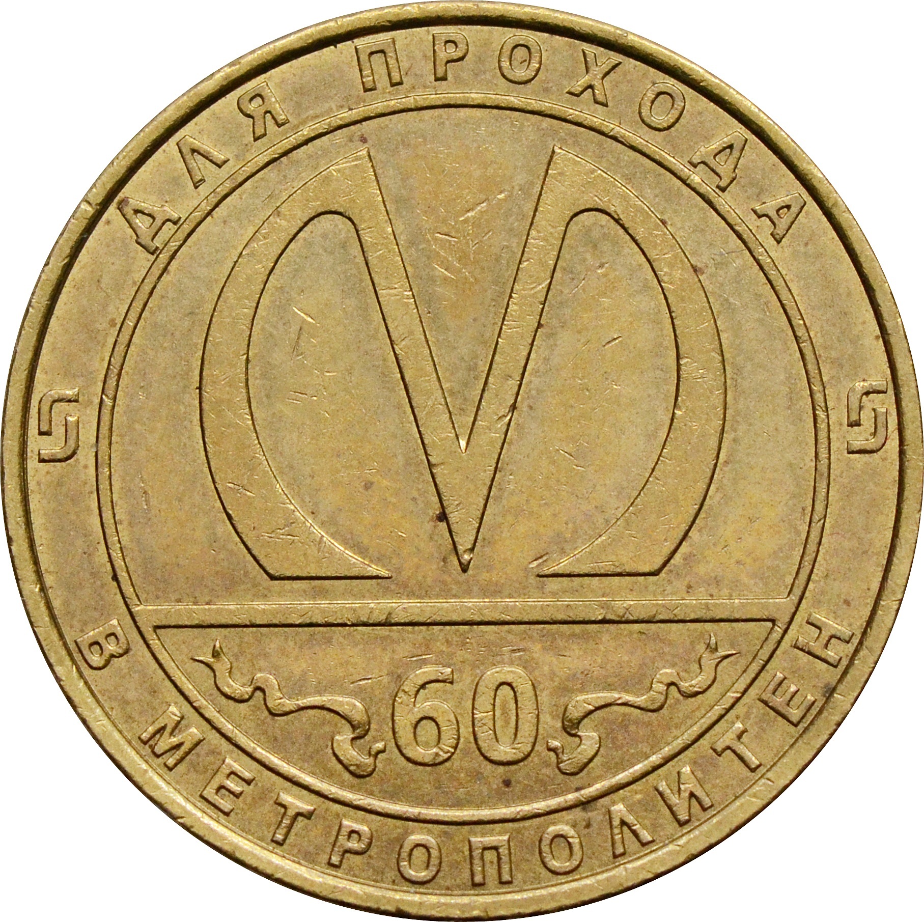 Лицевая сторона: по центру изображена большая буква - "М" и цифра "60". Вдоль канта надпись: "ДЛЯ ПРОХОДА В МЕТРОПОЛИТЕН".