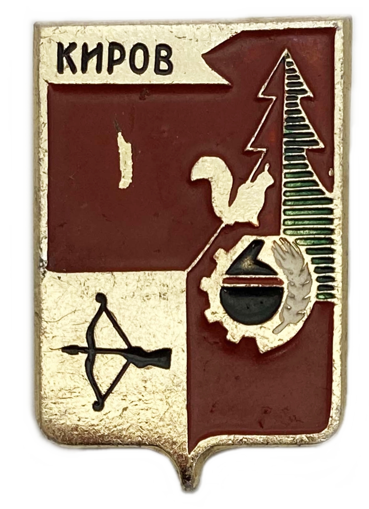 С правой стороны значка изображена ель с сидящей на ней белкой, обращенной влево. Подножие ели обременено диамантовой ретортой, окруженной полушестерней и колосом. В нижней части слева выходящая рука держит натянутый диамантовый лук со стрелой. Сверху слева надпись: "КИРОВ"